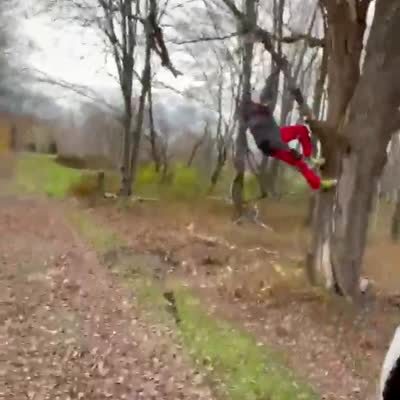 Teen boy rides bike off ramp on dirt trail/road into pond, flies off bike and screams.