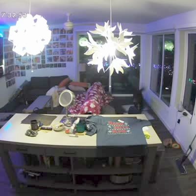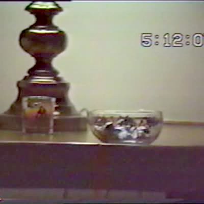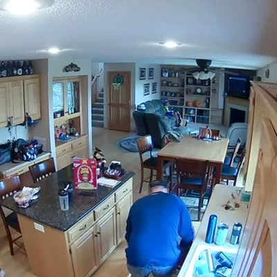 A kitchen cabinet bursts open and dishes crash onto the floor and scare a man as he watches TV in a living room. Home security camera video.