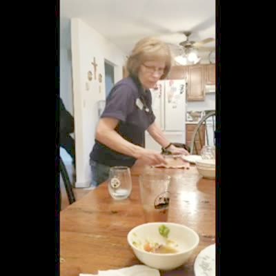 A woman carries a dog's water bowls and puts them on the floor. She slips and falls headfirst into one of the bowls. Security footage.