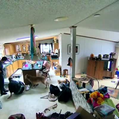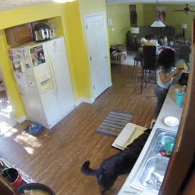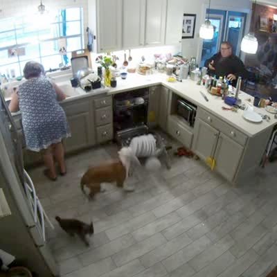 A dog gets caught in a dishwasher rack and he slams the rack and the dishes back and forth to break free. A cat in the kitchen is startled. A woman laughs. Security footage.