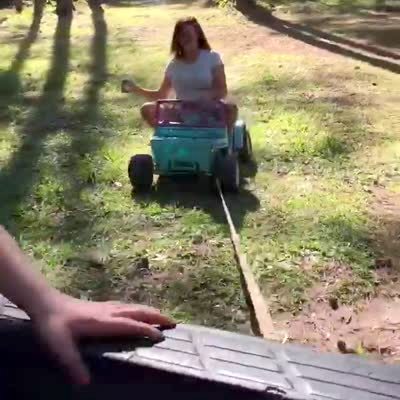 A woman sits in a toy car as her family pulls her behind the real car, and drive down the street. The toy car crashes into a satellite dish, and falls apart.