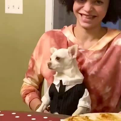 A white chihuahua dressed in a suit and tie sits upright in a woman's lap at the dining room table. Off-camera people laugh.