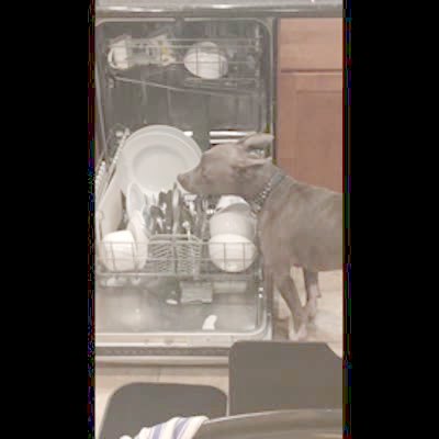 A pit bull dog gets stuck on the bottom rack of the dishwasher, then drags the rack across the kitchen floor. Security footage.