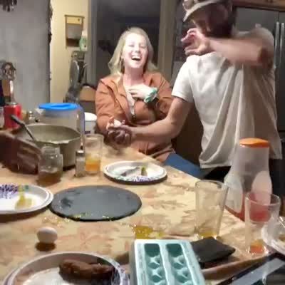A man and woman play "extreme rock paper scissors" in a yard, and whoever wins gets to dip the other's face in flour, syrup, ketchup, mustard, and barbecue sauce. The man gags repeatedly. At the end they kiss, with food all over their faces.