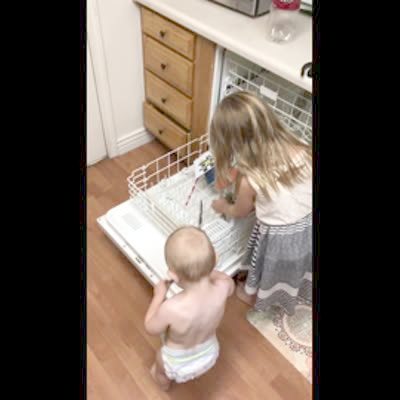 As a dad puts dishes in the dishwasher, his twin toddler daughters take them out, one by one. He thanks them for helping.