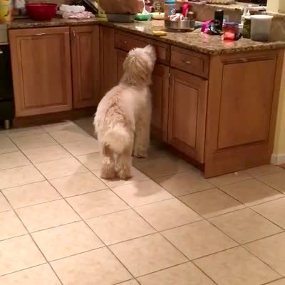 A dog jumps onto the kitchen counter to grab a bagel, and pulls down a pile of dishes. The dog is scared but comes back for the bagel.