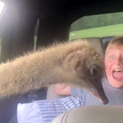 A young boy screams loudly as an ostrich bird sticks its head through his window to eat out of the food dish in his hand at a drive-thru safari.