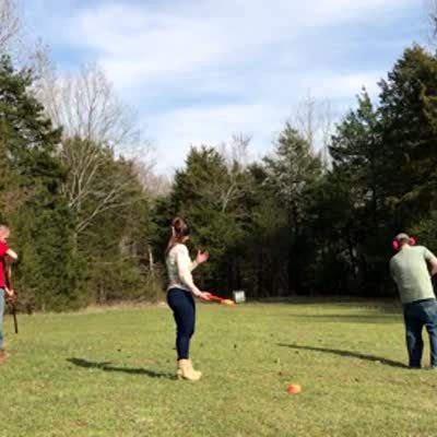 A woman goes to throw a clay pigeon disk for skeet shooting and accidentally hits a man with the disk.