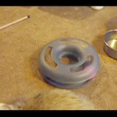 A ferret plays with the pink ball part of a cat toy by pushing it around in circles.