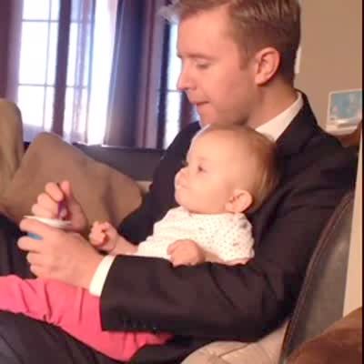 A baby girl eats yogurt and wants a second bite but her dad is distracted by the TV and holds the spoon too far away.