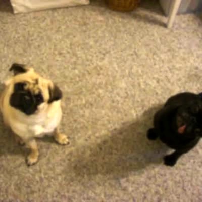 2 pugs tilt their heads when man whistles off-camera. Shot from above the dog's heads. Long for edit.