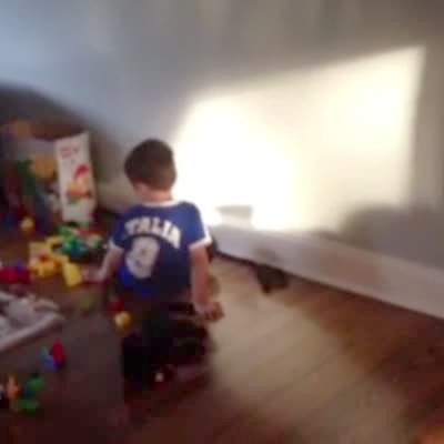 A little boy makes shadow puppets with his hands indoors and then gets distracted. An adult off camera makes a scary shadow puppet that snaps at him, startling the boy. The woman behind the camera laughs.