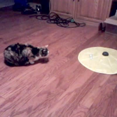A cat stares at a cat toy until a man sneaks up on the cat and scares it.