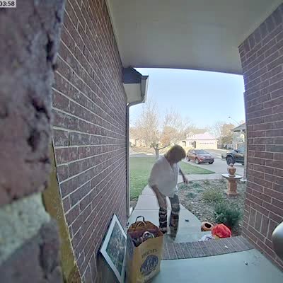 A senior woman drops off gifts for her son and granddaughter on a front porch step, then at :42 she trips and falls backwards on the front lawn. Security camera footage.