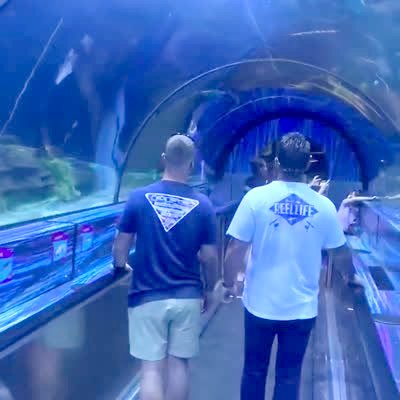 People stand on an automatic walkway in an aquarium. They are too busy looking at the fish and don't see the end of the walkway. Two men fall on top of each other. Featured talent cleared only (the two men who fall).