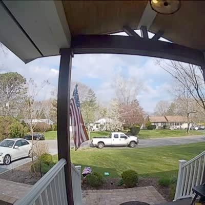 A woman walks out to the mailbox and on the way back she walks up the driveway and smacks her head against the rearview mirror on a truck. Security footage.
