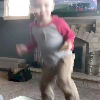 A young boy jumps on a couch in the living room and slips and falls off the edge.