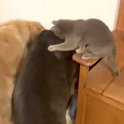 A kitten cat climbs onto a dog's back as it tries to eat in a living room.