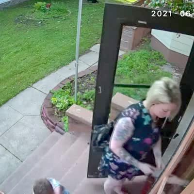 A woman walks up to the front door of a house when she trips and falls. Security footage.