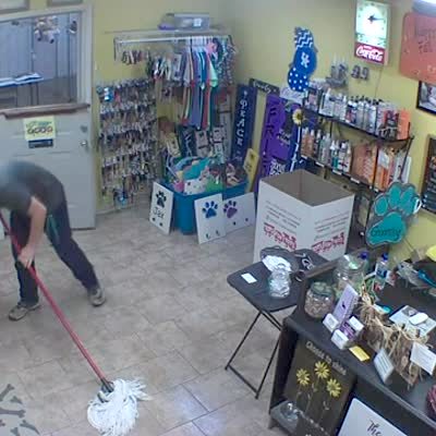 A young man dances and sings as he mops a floor, then he falls out of a door while he works at a dog groomer. Security footage.
