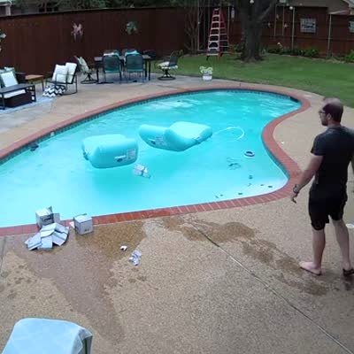 A man falls into a pool with a stack of empty boxes in his hands. Security footage.
