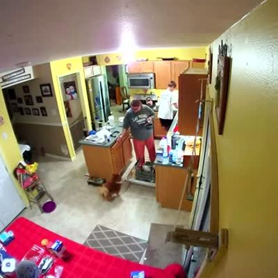 A teen boy trips and falls backwards onto an open dishwasher door in a kitchen. Security camera footage.