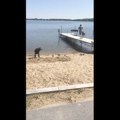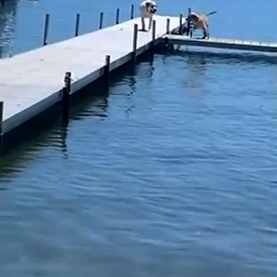 Two Labradors run down a dock to a woman behind the camera, then one dog falls into the lake.