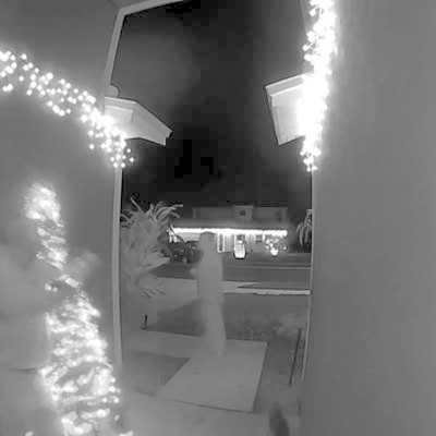 A man falls into a Christmas tree then knocks it over when he walks onto the front porch. Security footage.