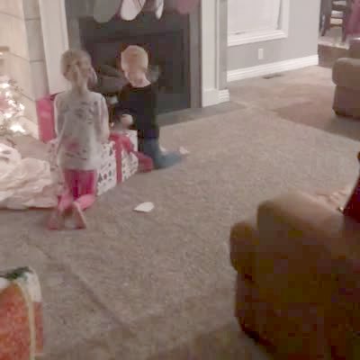 A young girl and boy start to open a Christmas present in the living room, but get distracted by their elf on the shelf on the Christmas tree. While they're distracted a puppy dog crawls out of the box they were in the middle of opening and then they get excited when they see their new dog.