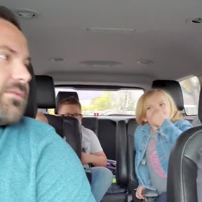 A woman sprays something in the car while a man distracts their kids, and they all start to gag and cough at the smell while the man acts like he farted.