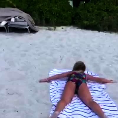 A boy runs and jumps over his sister as she lies in the sand. Their tot brother tries to do the same when the girl turns to her side and the tot boy trips over her and falls on his face.