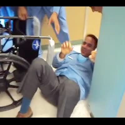 Male doctor does wheelie in wheelchair and falls at :07. Hops back in and says "Take me to room 3, please" at :29.