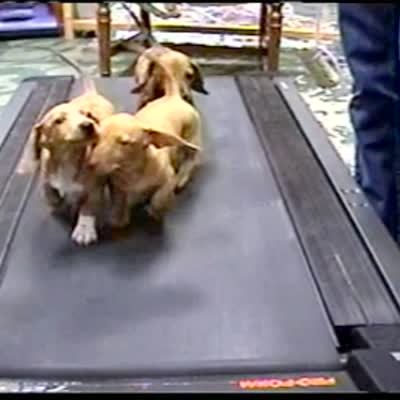 Three dachshund puppies run on treadmill, they chase after Milkbones hanging from strings. Dogs.