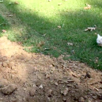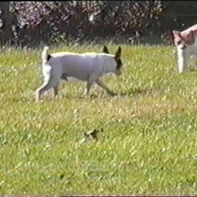 A man chases a dog through a front yard and a pet bird flies and follows him and a woman runs and chases the bird. They run off-camera but walk back to the house together.