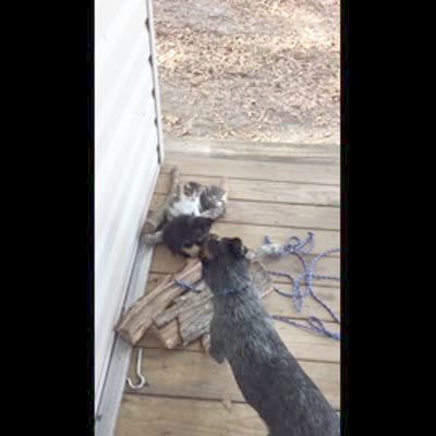 A dog plays with three kitten cats on a porch. A cat comes from behind the house and chases the dog away.
