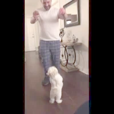 A man and a young girl dance together in a bedroom and at 0:57, a dog comes between them and stands up on its back legs to dance with the man.