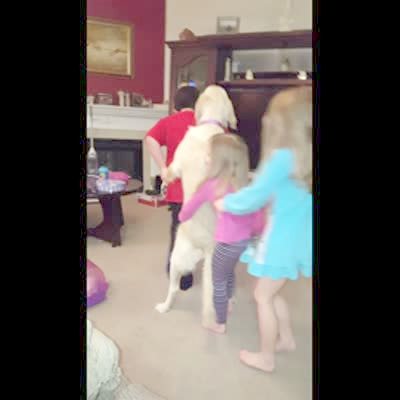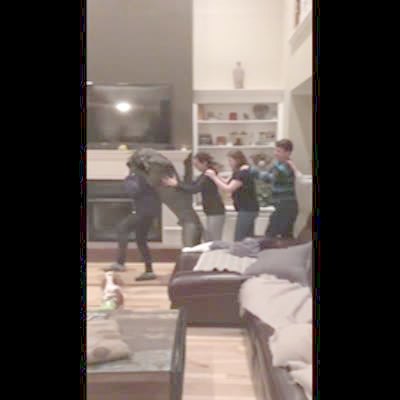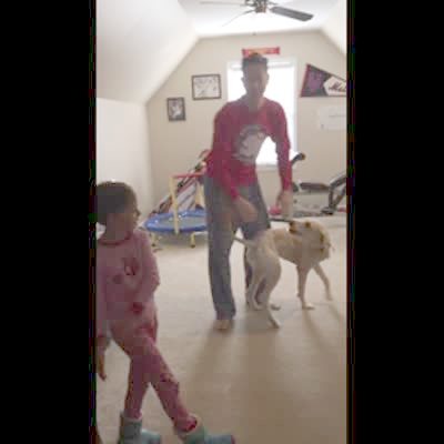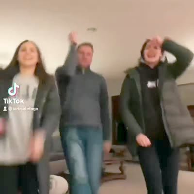 Two teen girls and their father dance in the living room. Two large dogs run through the room and cause the father to fall to the ground. Tik Tok video.