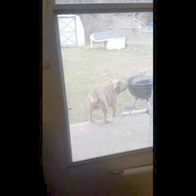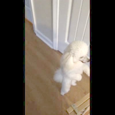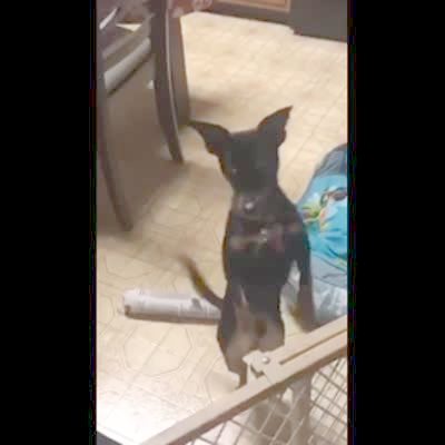 A man opens a front door and inside the house is a Boston Terrier riding on the back of a rocking horse to Old Town Road (music rights not included).