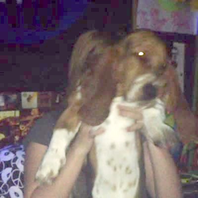 A woman shakes a basset hound puppy dog to music dancing with reflecting shiny eyes indoors. Glow