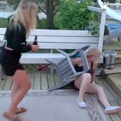 Two women dance on a deck patio. A dog runs behind them and knocks one of the women down.