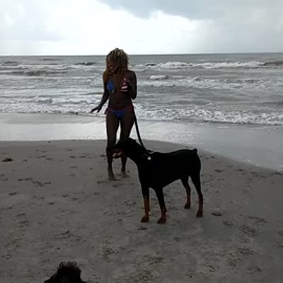 A woman dances on the beach holding a dog's leash and the dog runs making her fall down on the sand.