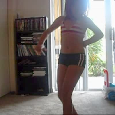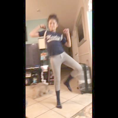 A teen girl dances in the kitchen. She does a kick and falls to the floor, hurting herself. Music rights not cleared.