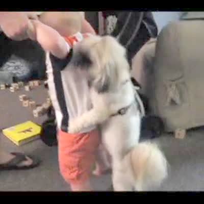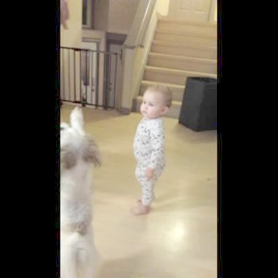 "Doggy Dance Off" Tot boy break dances on the floor of the living room, a small dog in a sweater comes over and rolls around on the floor next to him. Family laughs.