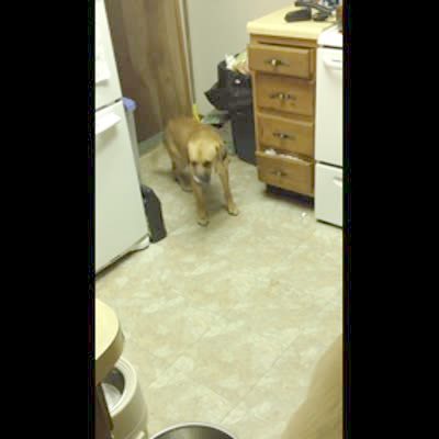 A young man dances and sings as he mops a floor, then he falls out of a door while he works at a dog groomer. Security footage.