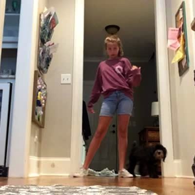 A teen girl tries to record a tap dance routine in the living room, but her dog runs in circles around her instead.