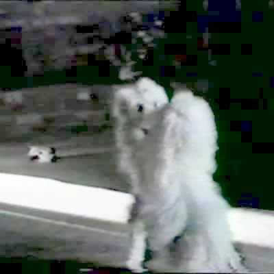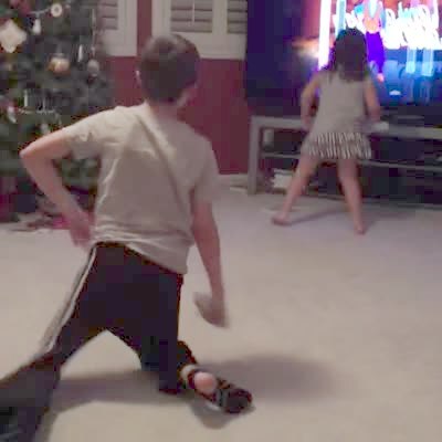 A brother and sister see a present on the front door. They see a dog poke it's head out and get excited and dance and scream around the house. AA: Christmas
