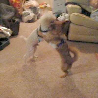 Poodle dog and small tan dog look like they're dancing while they play in the house.
