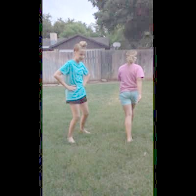 Two teen girls dance in a backyard barefoot outdoors. One girl steps in dog poop and screams at the other girl dancing, as well as the person recording.