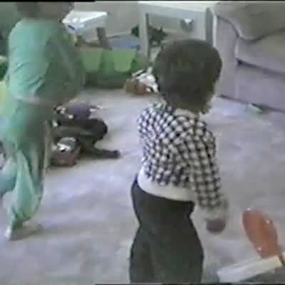 "Show-Stopping Sibling" A young girl dances to princess music in the kitchen, but she is interrupted by her baby sister with a kazoo, actually a dog toy.
