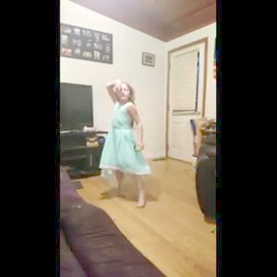 A young girl dances in the living room and at the height of the song her dog scoots its butt across the floor.